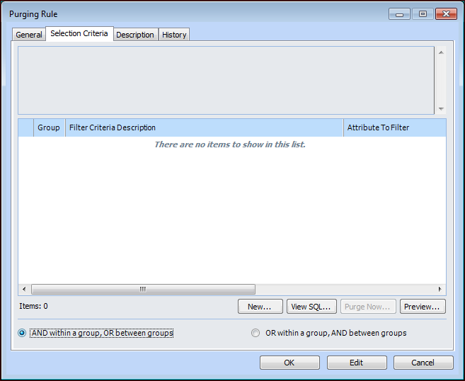 1. On the Purging Rule dialog, select the Selection Criteria tab.