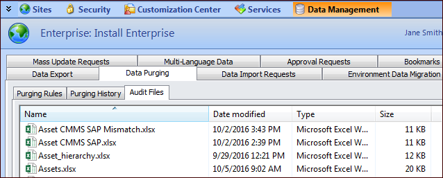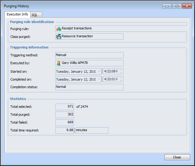 1. Open the purging rule and select the History tab.Tip: You can also view purging history for all purging rules. From the Data Management view, select the Data Purging tab, and then the Purging History tab.The SQL tab displays the SQL select statement that was generated to perform the purge. If your data purging settings specify that audit reports of purged data, audit reports of data that failed to be purged, or both are to be saved, the Purged Data and Purge Failures tabs are available.To View Audit Files