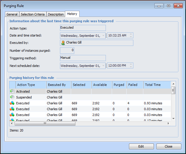 Viewing a Purging Rule’s History and Audit Files