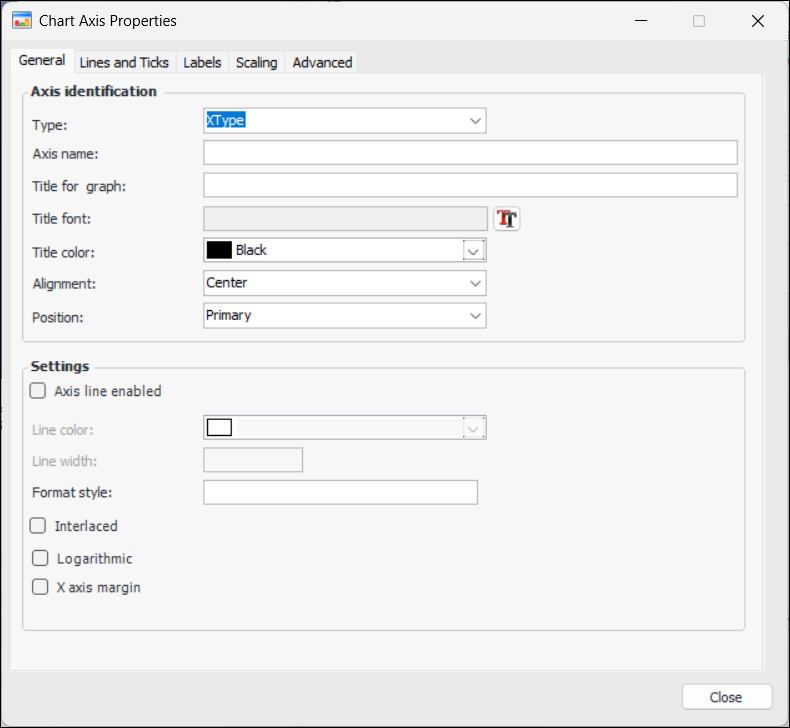 2. Select the Lines and Ticks tab from the Chart Axis Properties dialog. For example: