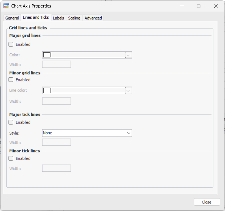 5. In the Major tick line area, select Enabled to enable major tick lines for the axis, and then select the color and width for the lines.