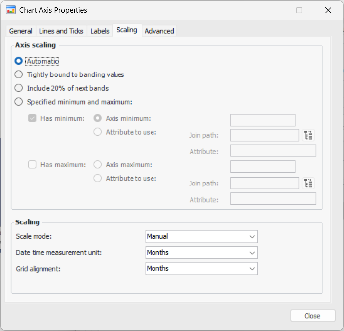 2. Select the Scaling tab on the Chart Axis Properties dialog. For example:
