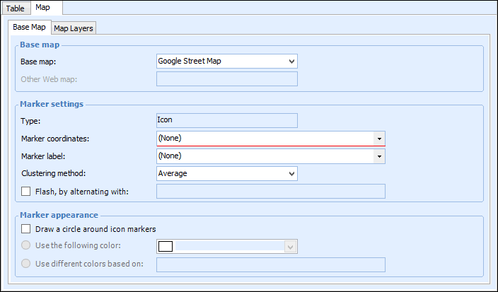 If the configuration column used for marker labels is numeric, you must select a clustering method. Options are: Average, Maximum, Minimum, Sum. This aggregate value is appended to the marker label when viewed on the map.