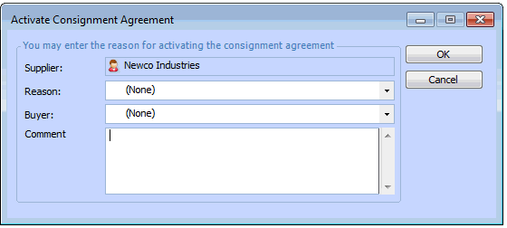 After you select the Activate consignment agreement option, the Activate consignment agreement dialog is displayed. On this dialog you can enter the reason for activating consignment support and a comment about the consignment agreement. This information is added to the supplier’s status change history for future reference.To Activate a Consignment Agreement for a Supplier