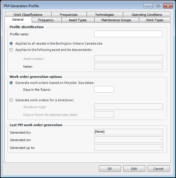 3. Click New. The PM Generation Profile dialog appears.The Last PM Work Order Generation area displays information about the last time that the PM generation profile was executed.