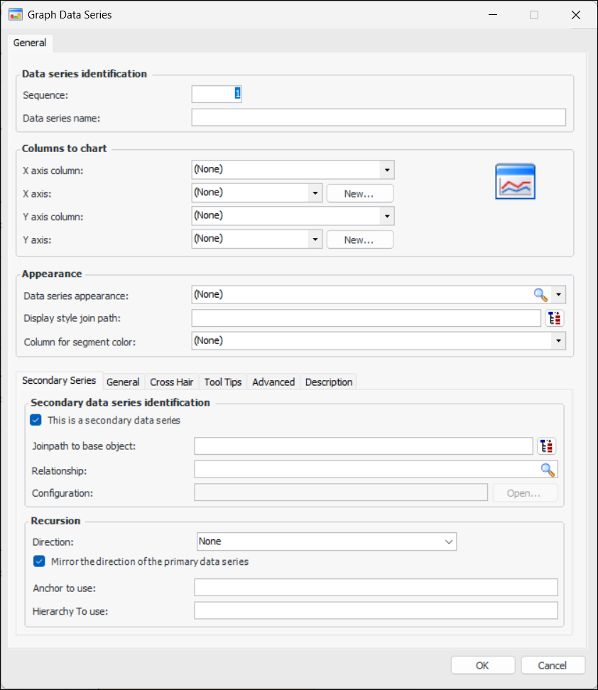 In APM, you can define secondary data series for charts by determining the columns to chart, appearances of the data series, legend, and tool tips, as well as other advanced features.To Define a Secondary Data Series for a Chart