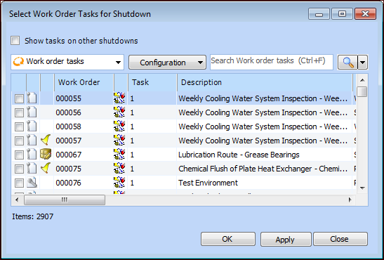 13. Select the Work Order Tasks tab to select tasks planned for the shutdown. Click Browse. The Select Work Order Tasks for Shutdown dialog appears, listing work order tasks for the site. For example:Tip: By default, the list excludes tasks that are associated with other shutdowns. To view and select them, click Show tasks on other shutdowns.