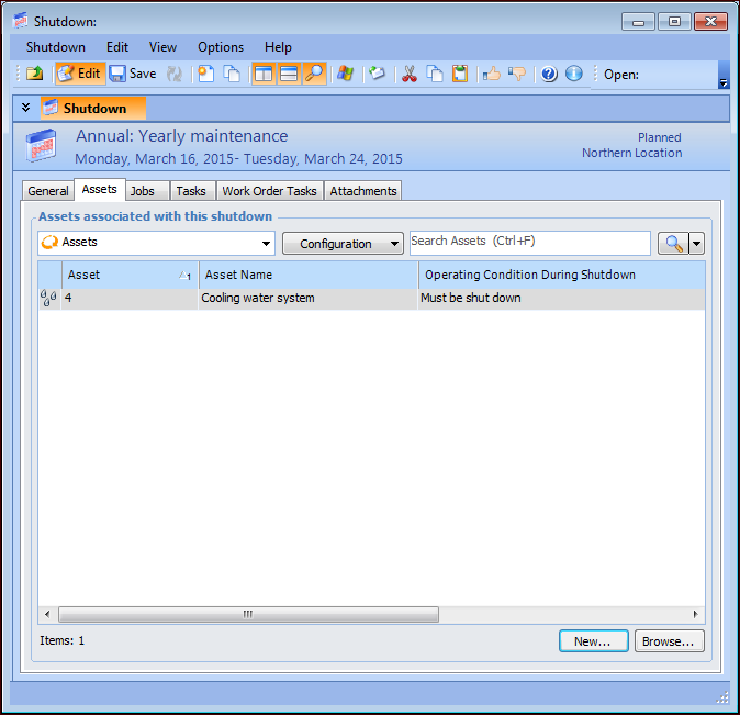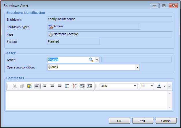 9. Click New to select an asset and an operating condition, and to provide comments:Click OK to close the Shutdown Asset dialog.