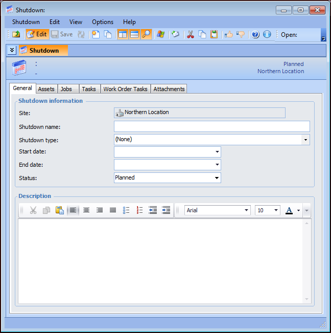3. Click New. The Shutdown window appears:Tip: Shutdowns are assigned to the site at which they are created, and they can be associated with objects at only that site. If you wish to create a shutdown at the enterprise level, open a shutdown type, select the Shutdowns view, and click New. Note that when you add a shutdown from the Shutdown Type window, you have the option of selecting a child site. See Setting up Shutdown Types.