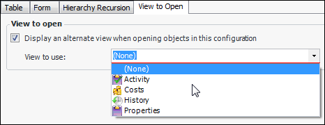 24. When a user double-clicks an object listed in the table, the object’s window opens showing the default view. You can specify an alternate view to display in the object window. Select the View to Open tab. Click Display an alternate view and select the view to use. For example: