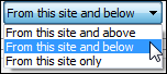 23. In the Recursion button properties area, you can allow upward and downward recursion. Provide the button text that will appear in the list at the bottom of the table, for example, “From this site and below”. Select the default direction shown in the list. For example: