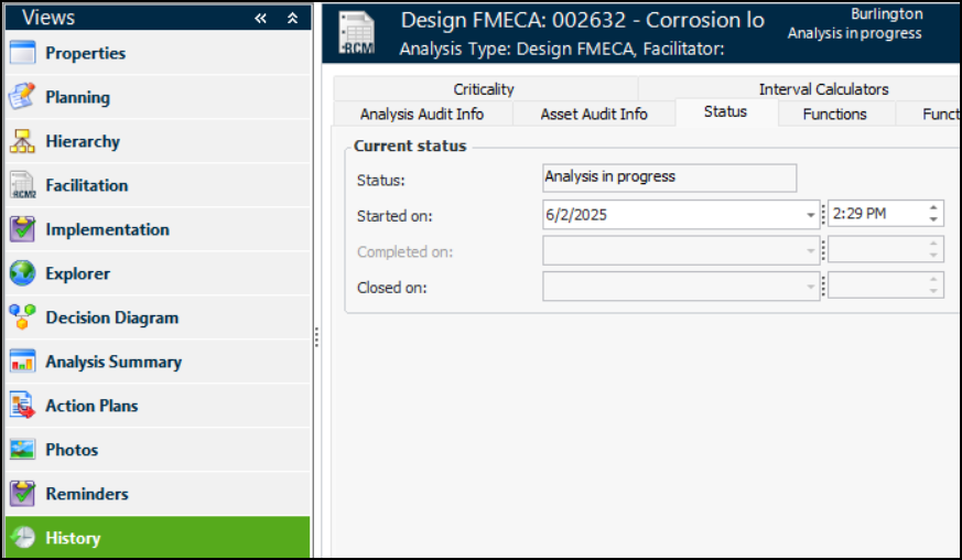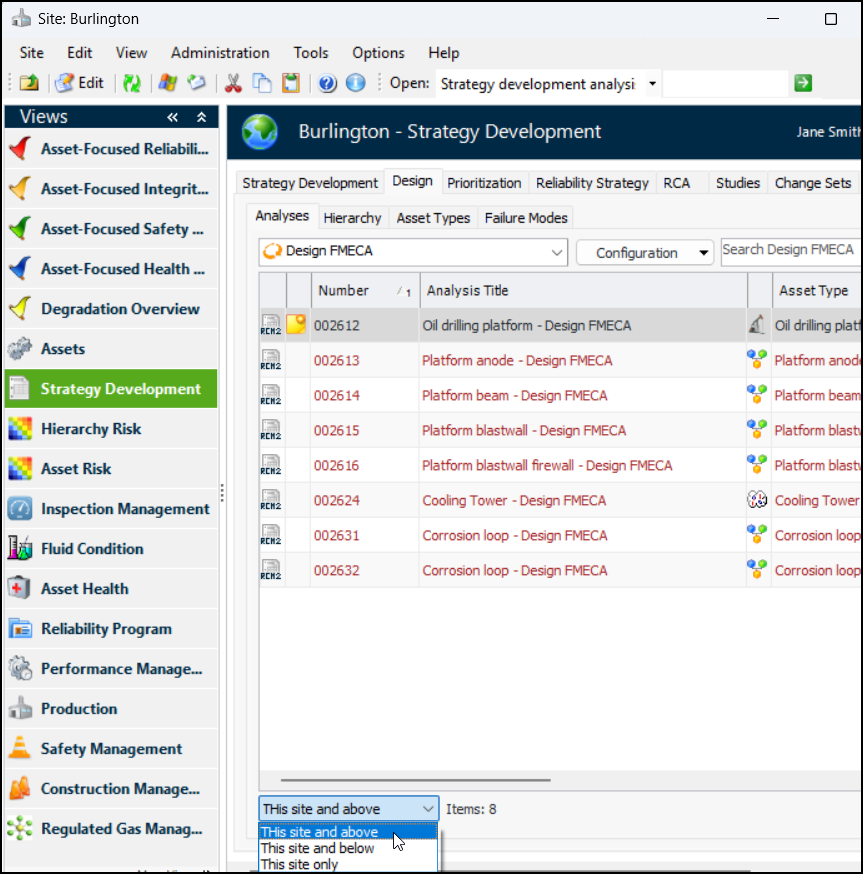 1. In the Site window, select the Strategy Development view, the Design tab, and the Analyses tab. By default, this tab lists FMECAs that have been developed for this site and above. You can filter the display by selecting a different option at the bottom of the tab: