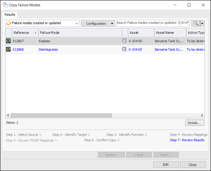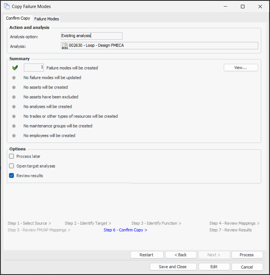 17. Review the items that will be created or updated. If an incorrect copy request is processed, you will have to make the corrections manually. Click View to see more details about the items.The Failure Modes tab shows information about the source failure modes. If you wish to remove a failure mode from the list, right-click it and click Remove. Click Back to make adjustments on previous pages.