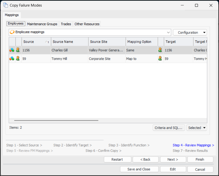 • To Be Determined – you can select the mapping option laterFor employees, trades, and maintenance groups, the Mark as options are New, Same As Source, and To Be Determined.Note: If a mapping is marked as To be determined, the copy request cannot be processed. However, you can save and close it until you decide what to do with it. You can then re-open the request from a Copy Requests tab and finish defining and processing it. For more information, see Revisiting FMECA Failure Mode Copy Requests.