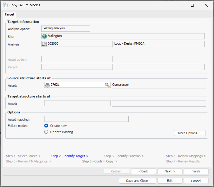 • Update existing – the source failure modes’ properties are copied to the target failure modes