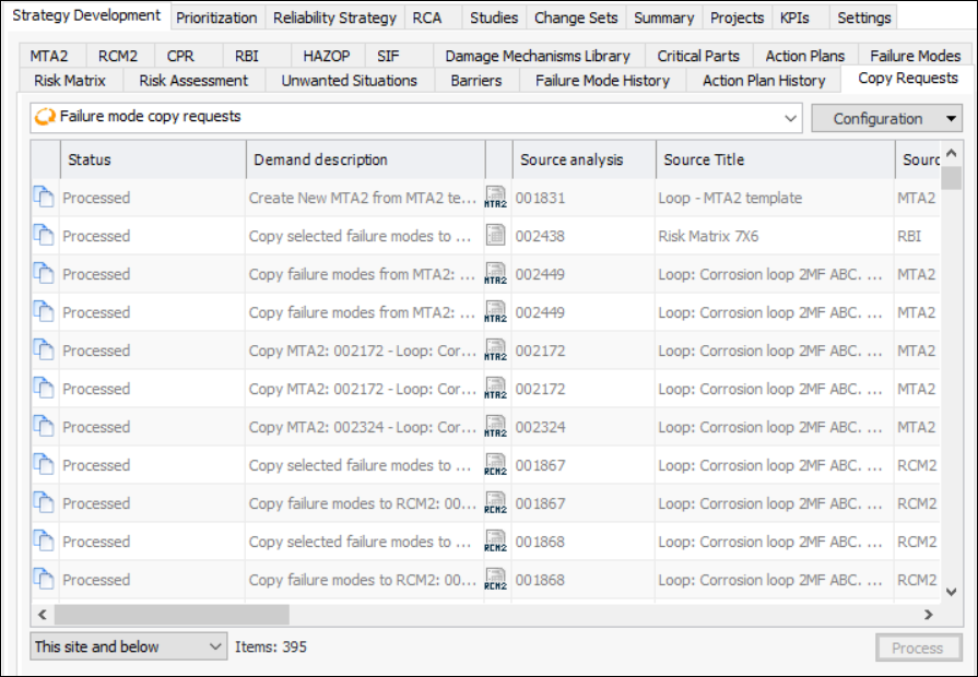 • On the Site window, select the Strategy Development view and tab, and then the Copy Requests tab. This tab displays all of the copy requests for the site. The following configurations are available: failure mode copy requests, processing to be reviewed, not processed, and processed.