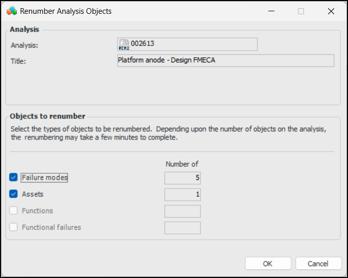 Tip: You can see the function, functional failure, and failure mode sequence in several locations, for example Facilitation view, Decision Worksheet tab.To Renumber Analysis Objects