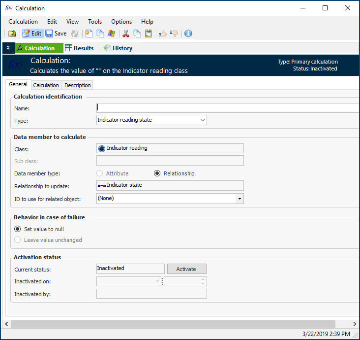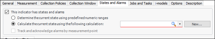 2. In the Properties view, select the States and Alarms tab, and ensure that both This indicator has states and alarms and Calculate the current state using the following calculation are selected.Tip: APM Administrators can also create calculations from the Enterprise window, Customization Center view, Calculation tabs.Note: The Calculate option is not available when Track and acknowledge alarms by measurement point is selected. Measurement point readings must be aggregated to use calculations.