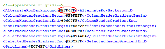 4. To change the alternate row color for table configurations, scroll down to the section <!--Appearance of grids--> and find the <AlternateRowBackground> attribute value.