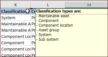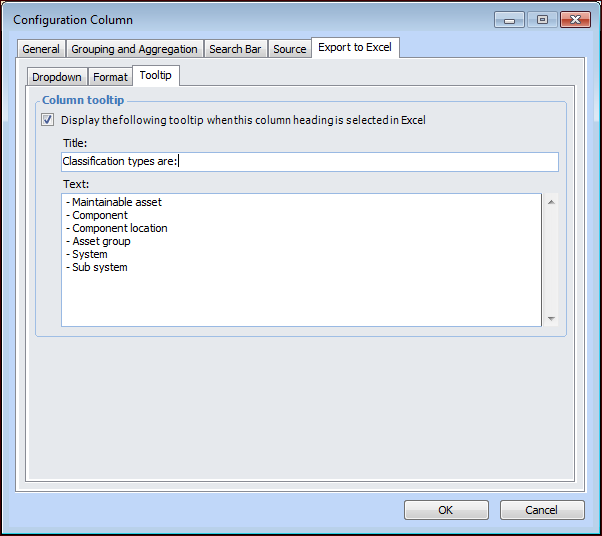 12. Select the Tooltip tab to include information in the exported Excel file. Users can hover the cursor over the comment flag in the column heading to view the tooltip. For example: