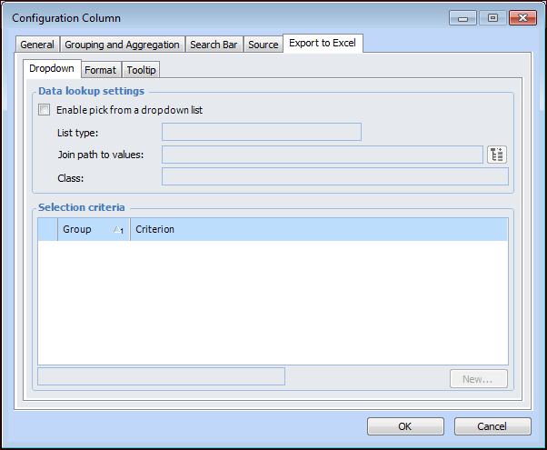 10. The Dropdown tab is available when the property’s values are already defined in APM. Select Enable pick from a dropdown list and select the list type and join path to values. Then click New to define the dropdown selection criteria. Repeat for each dropdown selection criteria.