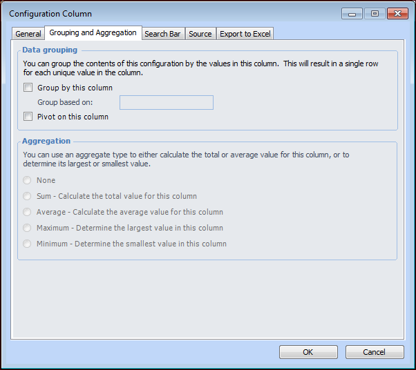 6. Select the Grouping and Aggregation tab to set options for data groups. Once you have created a data group, you can include a summary of any numeric data available for the items in the group. For example, in a table configuration of assets, you might group the assets by asset type. If you include the Priority Ranking column in the configuration, you could then include the average priority ranking in the group summary. For more information about data groups and aggregations, see Creating Data Groups in Table Configurations.