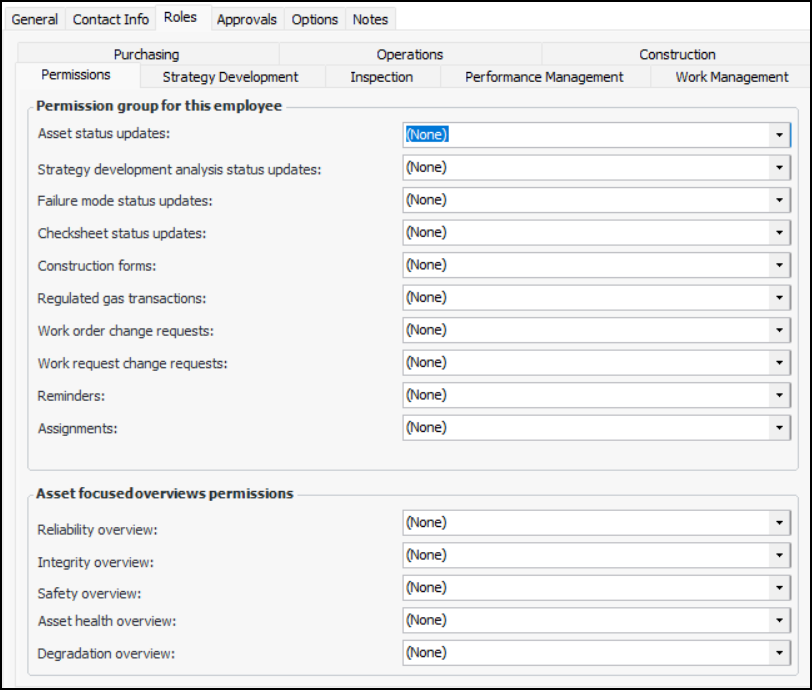 In the case of regulated gas transactions, group members can select only the specified gas and transaction types when entering gas transactions. For example, the “Electrician” permission group might be restricted from entering gas recovery transactions for SF6 gas. When a group member creates a transaction, “Gas recovery” is not available in the Transaction type list and “SF6” is not available in the Gas type list.Note: We recommend using security profiles to identify employees who have the authority to perform actions. Employee permission groups allow you to fine-tune security by restricting access at a more granular level. For more information, see Security.To Select Roles and Permissions for an Employee