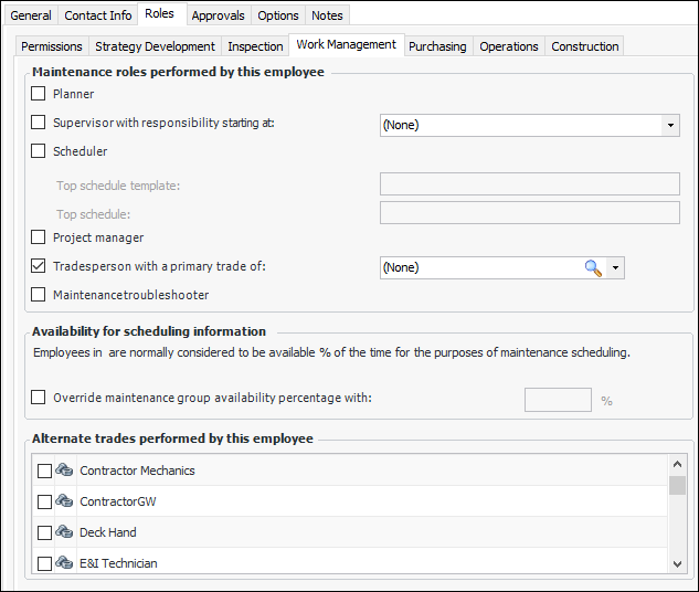 Note: Only trades that are set to have either Maintenance only or Both maintenance and purchasing as an Available source will be available for selection.