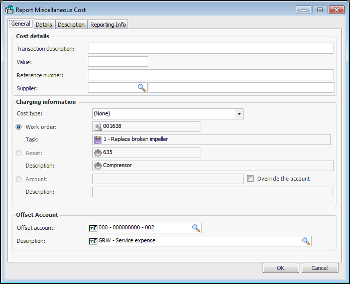 To create a miscellaneous maintenance cost transaction, you must have a cost type to which you can charge the transaction. Miscellaneous transactions can only be charged to cost types where the Miscellaneous expenses option is set to Available for use.To Create a Maintenance Miscellaneous Cost Transaction