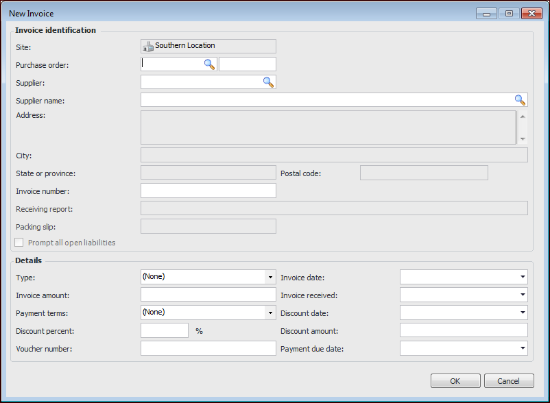 3. To create an invoice that is based on a purchase order, enter the purchase order number or click Browse to select the appropriate purchase order.If you enter a purchase order in the dialog, the system fills in the supplier name and number and displays the option Prompt all open liabilities. When this option is selected, the system creates an invoice line for each un-invoiced transaction related to the purchase order. If necessary, you can clear this option.
