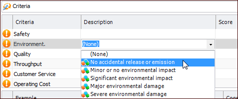 3. Select the Worksheet view. For example:Tip: You can also select the Properties view, Assets tab. Double-click the asset that you wish to analyze. You can then enter scores in the Analysis Asset window.Tip: When returning to an analysis to complete it, you can select the “Analysis incomplete” configuration in the Worksheet view. The table lists the analysis assets for which criteria have not been analyzed.