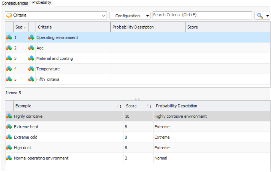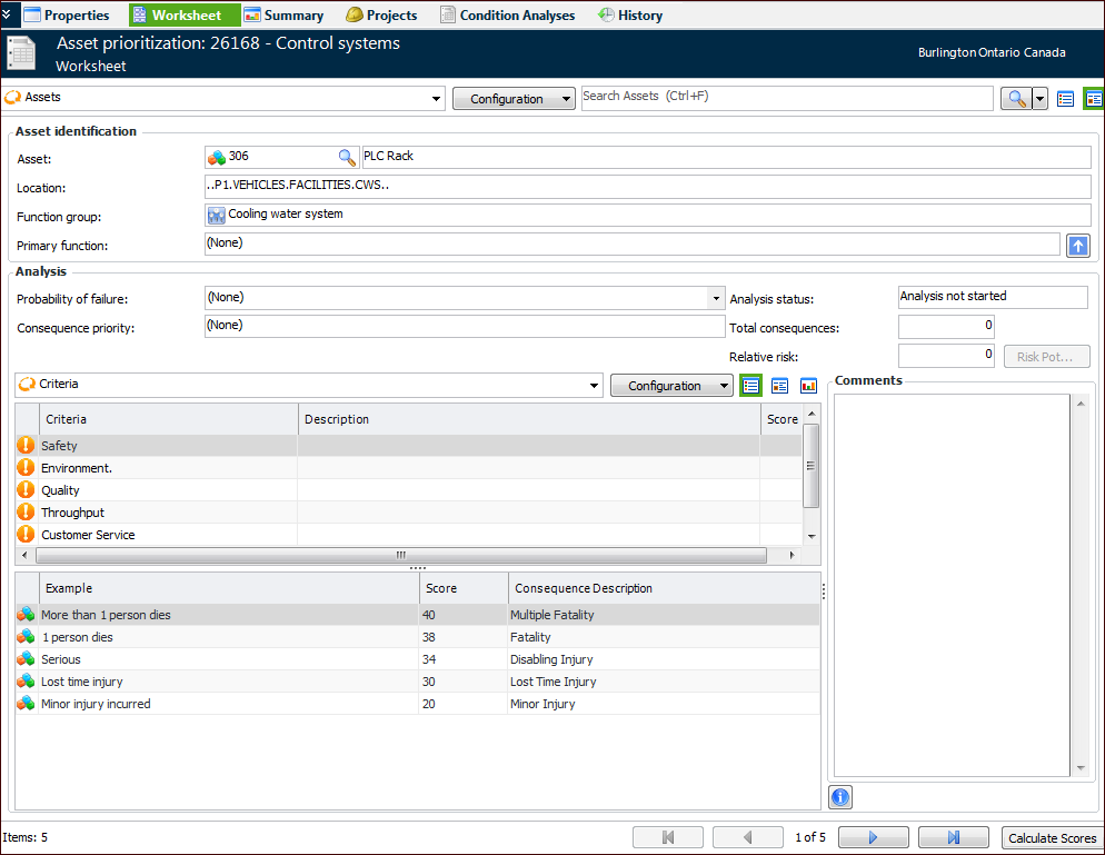 12. Click Calculate Scores. The Probability of Failure, Consequence Priority, Total Consequences, and Relative Risk boxes are populated with values.