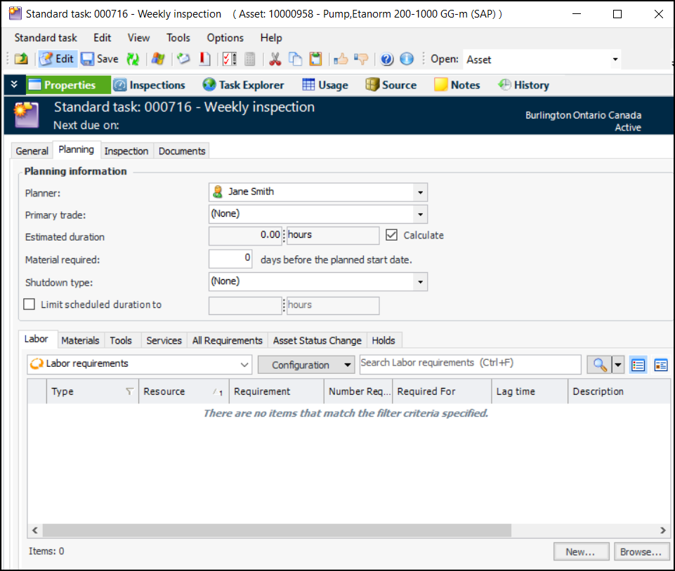 A task’s general planning information includes the start and completion dates, estimated duration, and the date by which materials are required. You can enter the name of the planner, select the shutdown type, and select or change the primary trade for the task. You can also add the material, labor (trade and service), and tool requirements for the task.Note: If you are changing a standard task that was created from a task template, see Editing a Standard Task that is Based on a Template.This topic explains how to enter information relating to the task’s dates and labor and material requirements.To Enter Planning Information for a Standard Task