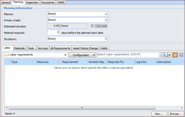 A task’s general planning information includes the planned start and completion dates, the task’s estimated duration, and the date by which materials are required. You can enter the name of the planner, the shutdown type, and select or change the primary trade for the task. You can also add the material, labor (trade and service), and tool requirements for the task.This topic explains how to enter information relating to the task’s dates,material, and labor requirements.To Enter Planning Information for a Task Template