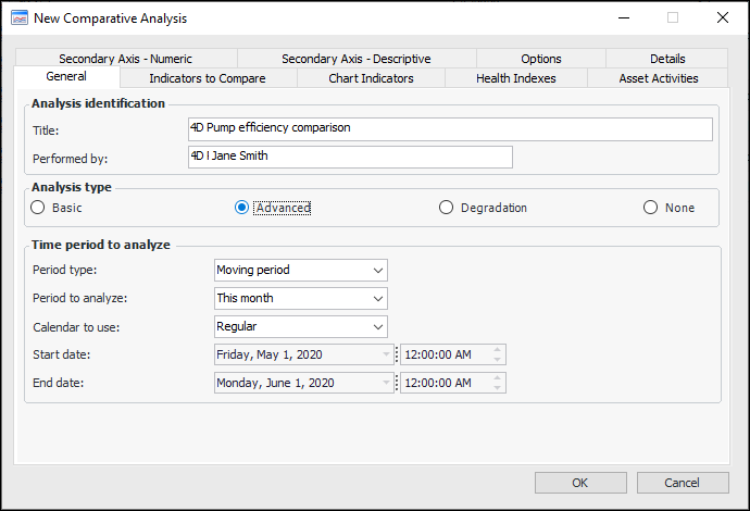 • Moving period: Select this option to set a time period that is relative to the current date. For example, if you are setting a time period for a comparative analysis, you could create an analysis for readings collected in the last month. If you select this option, each time you open the analysis or dashboard, you might see a different set of readings depending on the current date and the period that was selected to analyze.