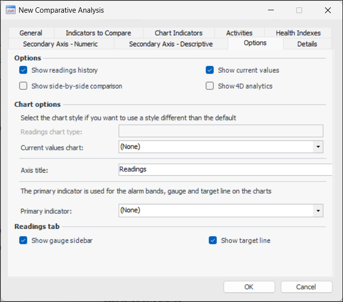 18. Click Descriptive indicator and select a descriptive indicator from those listed in the Indicators to Compare tab to show its readings on a secondary axis. Provide a title for the axis.