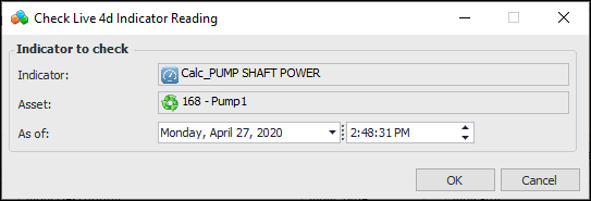 19. For 4D calculated indicators, you can use Check (Live) to test the calculation by retrieving input values from the Influx database, based on the date and time you specify. Here are two tips for determining the dates for input readings:
