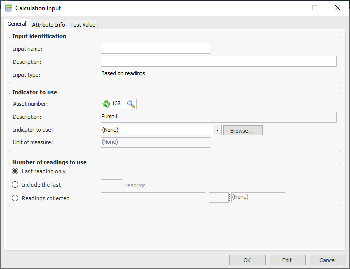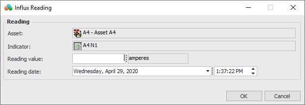 • Create Influx readings for each of the input indicators. Open each input indicator, click the Tools menu and then New Influx Reading. The Influx Reading dialog appears. For example: