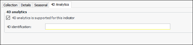 • Select a numeric indicator type from the Indicator type list. The tabs on the window change to reflect the numeric value type. Because the indicator type supports 4D Analytics, the 4D Analytics tab is added on the General tab.
