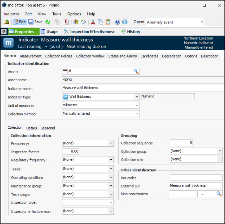 8. On the Collection tab, you can enter values that determine how often readings are expected and the next collection date. You can also enter information to make it easier to select this indicator when adding indicators to a work order task or standard task, when copying indicators to another asset, when setting up dynamic inspection routes, or when implementing reliability programs.