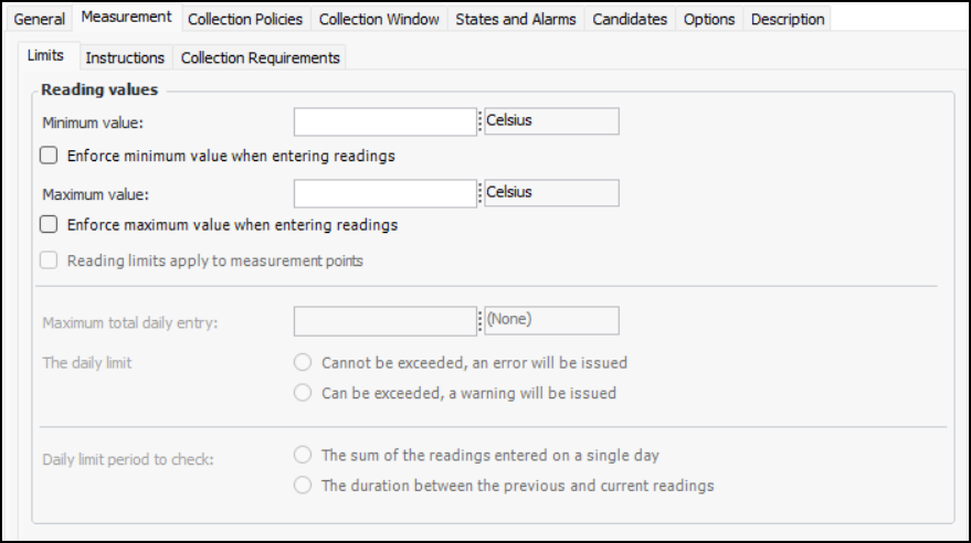 14. Select the Measurement tab and the Limits tab to set limits on the values that users can enter in readings. For example, if you enter a minimum value of 0.000 Celsius, a user who enters a negative number when recording a reading will receive the message, “The value entered cannot be less than 0.000 Celsius.”
