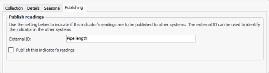 12. If the indicator type supports publishing indicator readings, the Publishing tab is available. Select this tab if you wish to publish processed readings for the indicator.