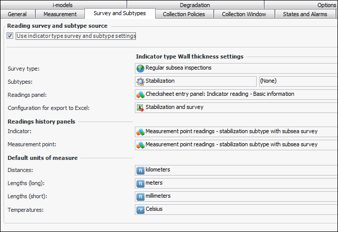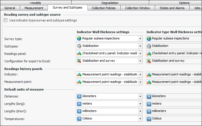 21. If the indicator type allows these settings to be overridden on individual indicators, you can clear Use indicator type survey and subtype settings. The default indicator and survey type settings appear on the right as a reference, and you can edit each option as needed. For example: