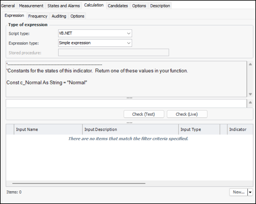 19. When you have defined the calculation expression and inputs, you can click Check (Test). The test function uses the values from the inputs (for example, indicator readings) and displays the result in the Test Reading window.