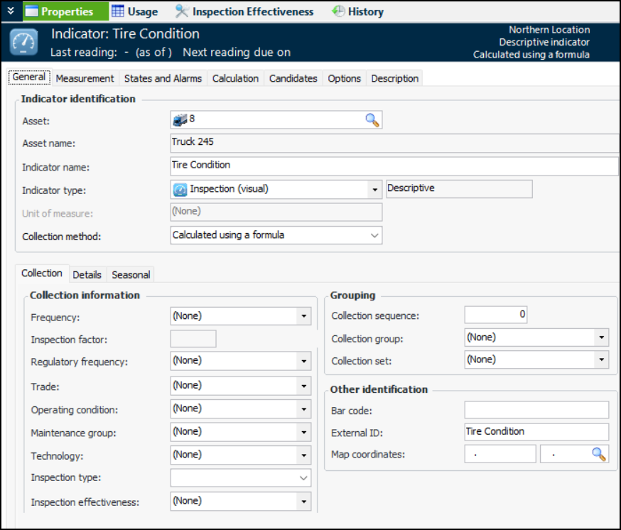 7. On the Collection tab, you can enter values that determine how often readings are expected and the next collection date. You can also enter information to make it easier to select this indicator when adding indicators to a work order task or standard task, when copying indicators to another asset, when setting up dynamic inspection routes, or when implementing reliability programs.