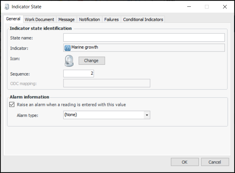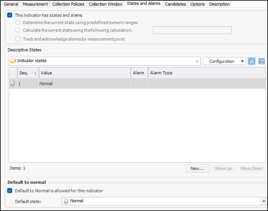 26. On the Descriptive States tab, add the values that users can choose from when they enter a reading for this indicator. The “Normal” state is added automatically. To add a state, click New. The Indicator State dialog appears.