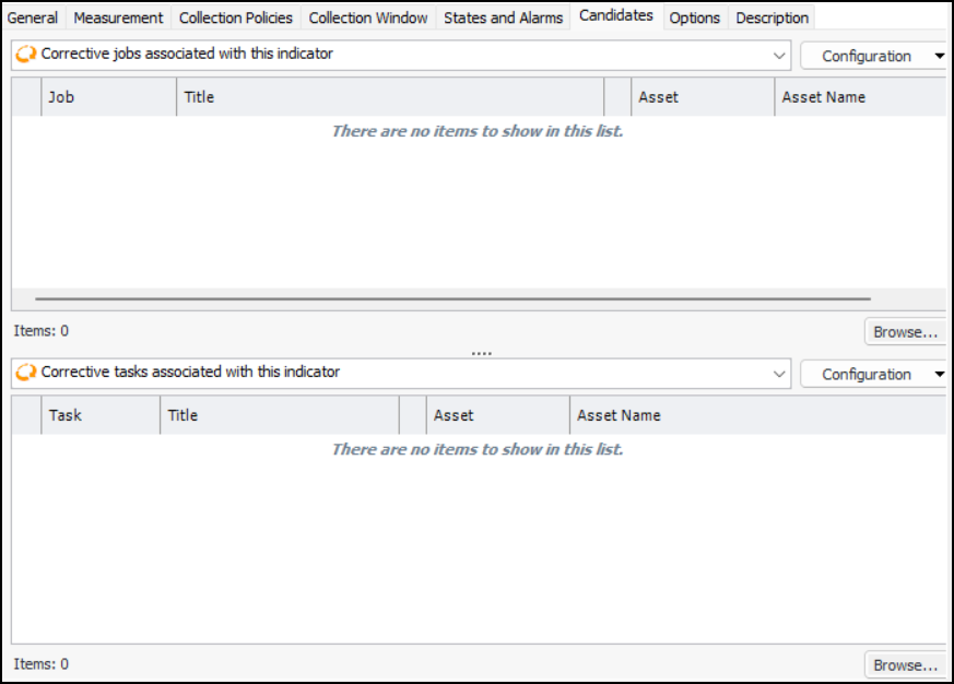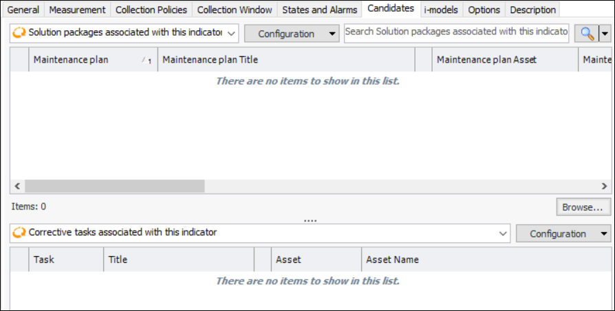 30. Select the Candidates tab.If APM has been configured to exchange data with an external CMMS using AssetWise Enterprise Interoperability (AWEIS), the Candidates tab displays tables listing solution packages and corrective tasks associated with this indicator. For example: