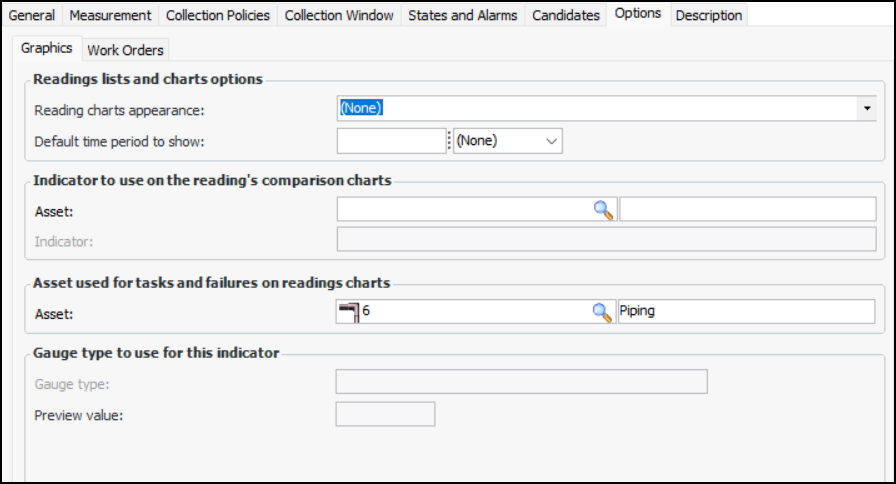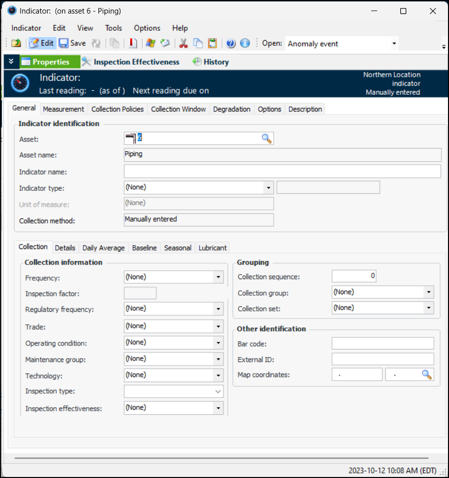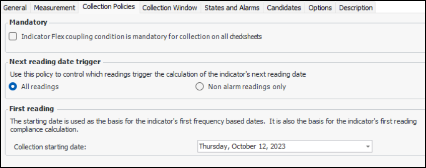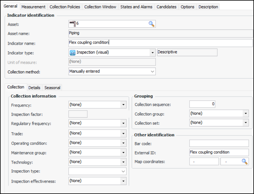 7. On the Collection tab, you can enter values that determine how often readings are expected and the next collection date. You can also enter information to make it easier to select this indicator when adding indicators to a work order task or standard task, when copying indicators to another asset, when setting up dynamic inspection routes, or when implementing reliability programs.