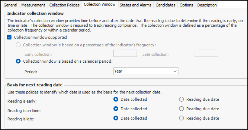 • Collection window is based on a percentage of the indicator’s frequency – Enter percentages in the Early collection and Late collection boxes.Note: This option is not available if a frequency has not been selected on the General tab, Collection tab.