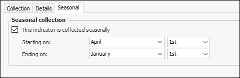 8. To specify the months during which readings should be taken, select the Seasonal tab. Click This indicator is collected seasonally and select the starting and ending dates. For example: